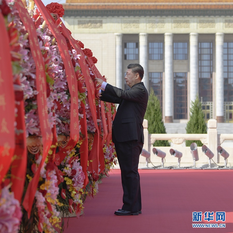 9月30日上午,黨和國家領導人習近平、李克強、栗戰(zhàn)書、汪洋、王滬寧、趙樂際、韓正、王岐山等來到北京天安門廣場,出席烈士紀念日向人民英雄敬獻花籃儀式。這是習近平整理花籃上的緞帶。 新華社記者 申宏 攝