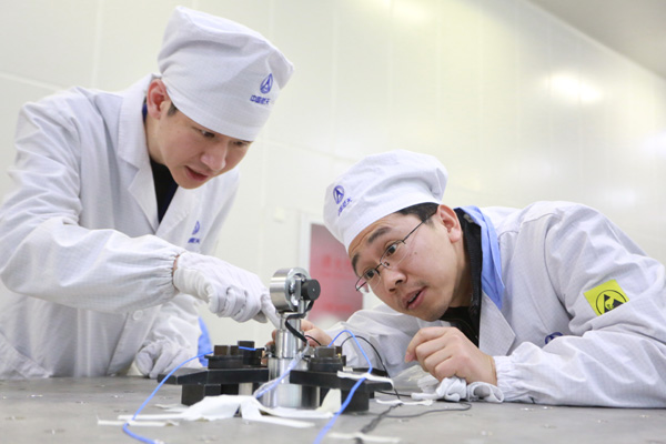 中國航天科技集團公司的青年科研人員在做產品試驗。