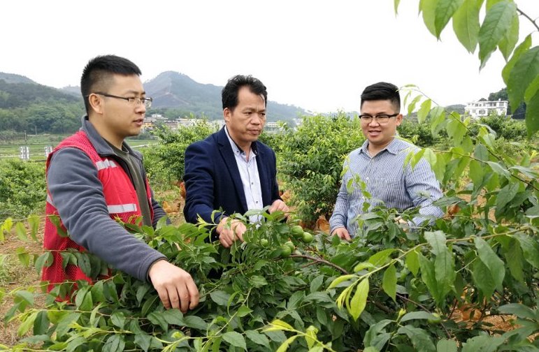 廣西馬山縣林圩鎮(zhèn)伏興村駐村第一書記周福波(左一)在查看村里已經掛果的三華李。