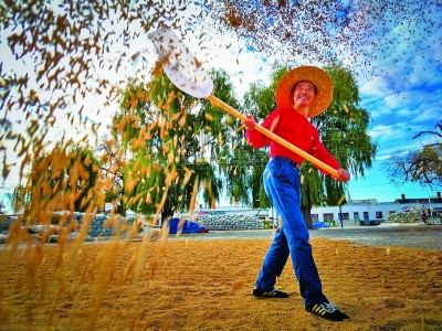 黑龍江寧安市渤海鎮(zhèn)上官地村水稻喜獲豐收,稻農(nóng)在晾曬場工作。王志軍攝