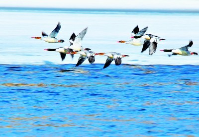 黑龍江伊春伊美區(qū)湯旺河翱翔的中華秋沙鴨。 王志富攝