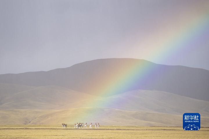 彩虹下的羌塘國家級(jí)自然保護(hù)區(qū)藏野驢。新華社記者 孫瑞博 攝
