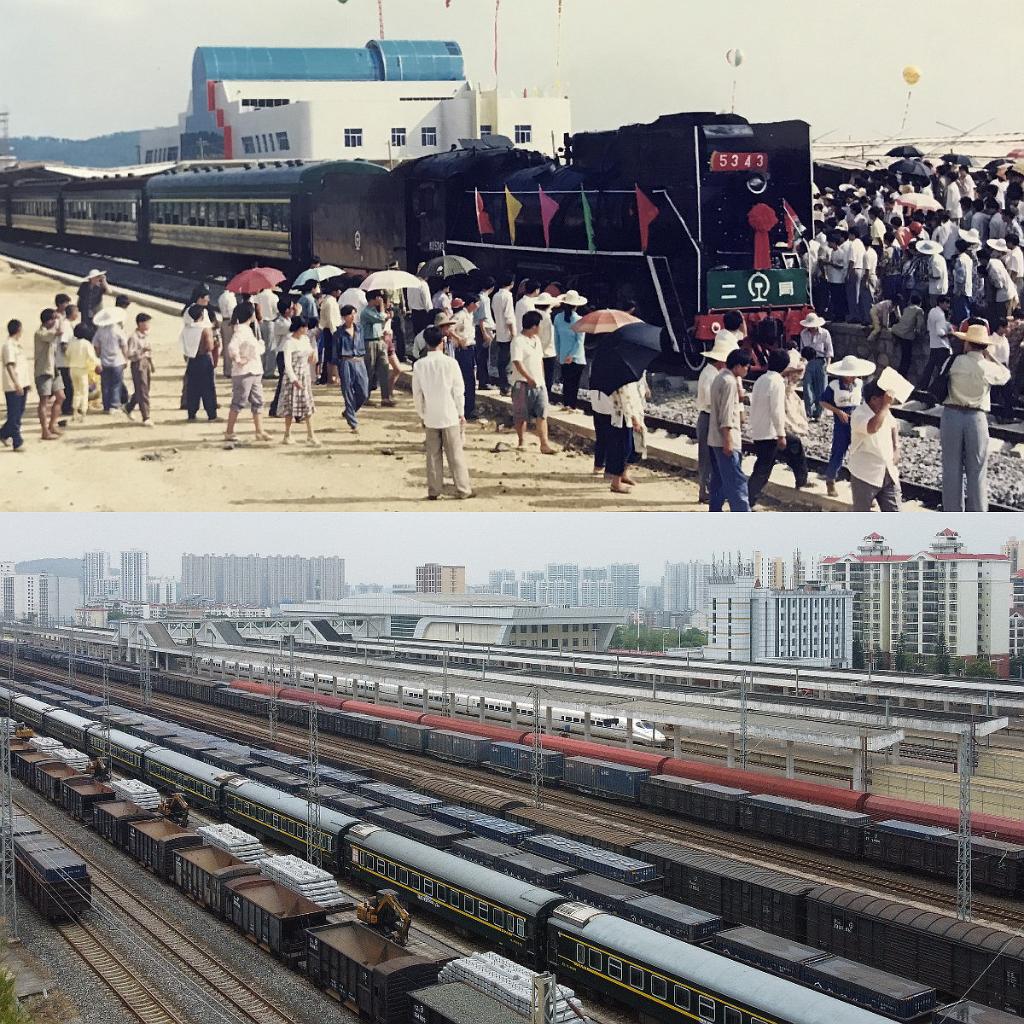 拼圖照片,上圖為1995年國慶節(jié)一列火車開進百色市火車站(資料圖片,中國鐵路南寧局集團有限公司提供);下圖為現(xiàn)在的百色市火車站客貨列運行景觀(5月8日攝,無人機照片)。新華社記者張愛林?jǐn)z