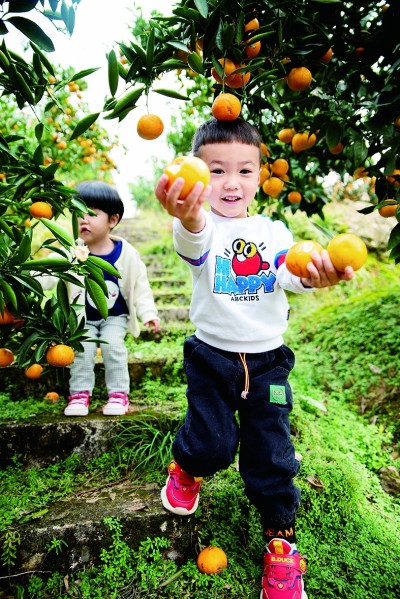 孩子們在湖北省宜都市高壩洲鎮(zhèn)陳家崗村鳳凰山柑橘基地采摘柑橘。宜都市委宣傳部供圖