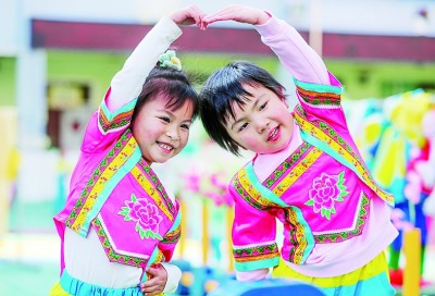 貴州省銅仁市玉屏侗族自治縣實(shí)驗(yàn)幼兒園的小朋友在進(jìn)行“時裝”走秀。胡攀學(xué)攝/光明圖片