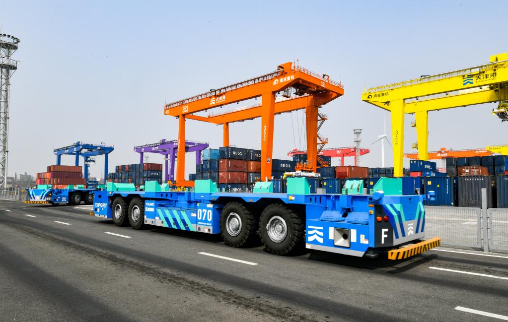 4月9日,在天津港北疆港區(qū)C段智能化集裝箱碼頭,智能水平運(yùn)輸機(jī)器人在堆場內(nèi)行駛。新華社記者孫凡越攝