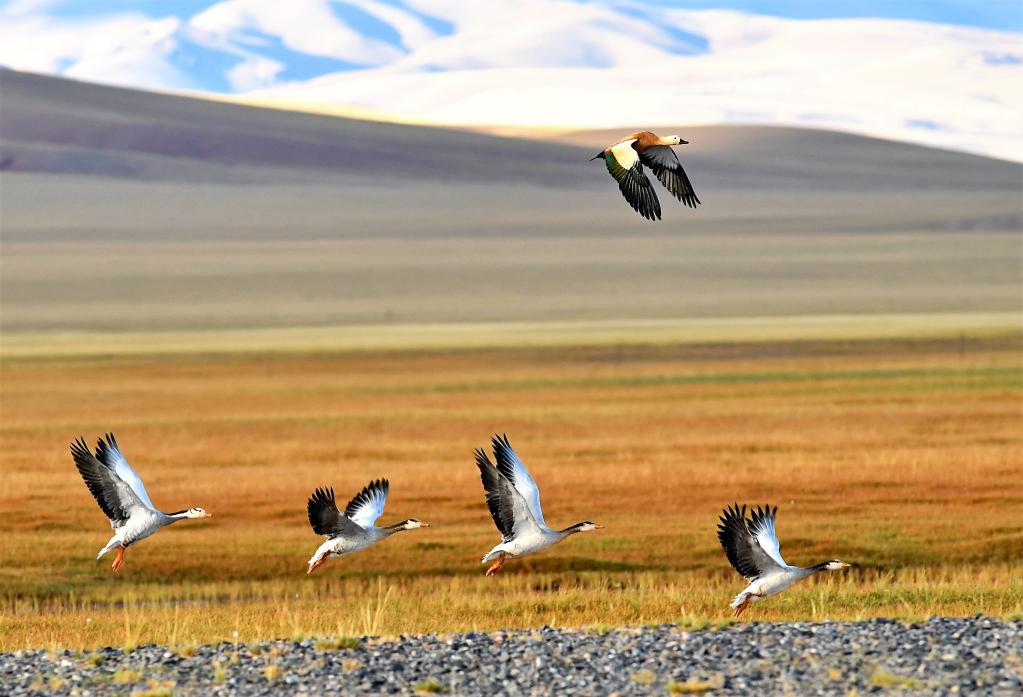 一只赤麻鴨(上)和一群斑頭雁在保護區(qū)尼瑪縣那若塘濕地上飛翔。新華社記者張汝鋒 攝