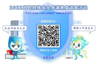 2022網民網絡安全感滿意度調查將于8月12日24時截止,更多詳細信息可登陸活動官網www.iscn.org.cn(網絡安全共建網)或“網安聯”微信公眾號。