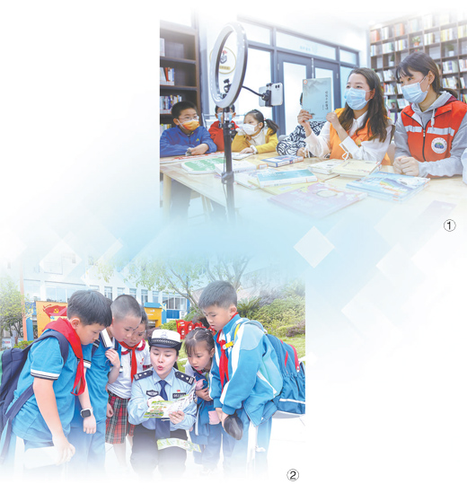 圖①:江蘇省如皋市如城街道聯(lián)合愛(ài)行動(dòng)實(shí)踐中心,走進(jìn)當(dāng)?shù)仡櫱f社區(qū)農(nóng)家書(shū)屋,通過(guò)“線上+線下”方式開(kāi)展“愛(ài)閱護(hù)苗”主題公益課堂活動(dòng)。圖為志愿者通過(guò)網(wǎng)絡(luò)平臺(tái)為學(xué)生推薦好書(shū)。
