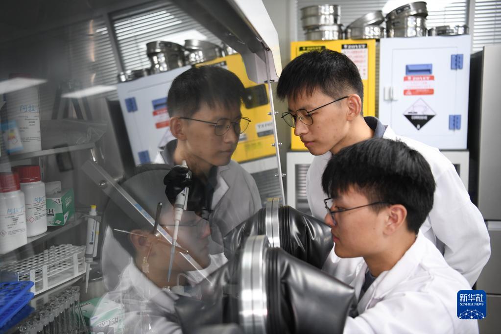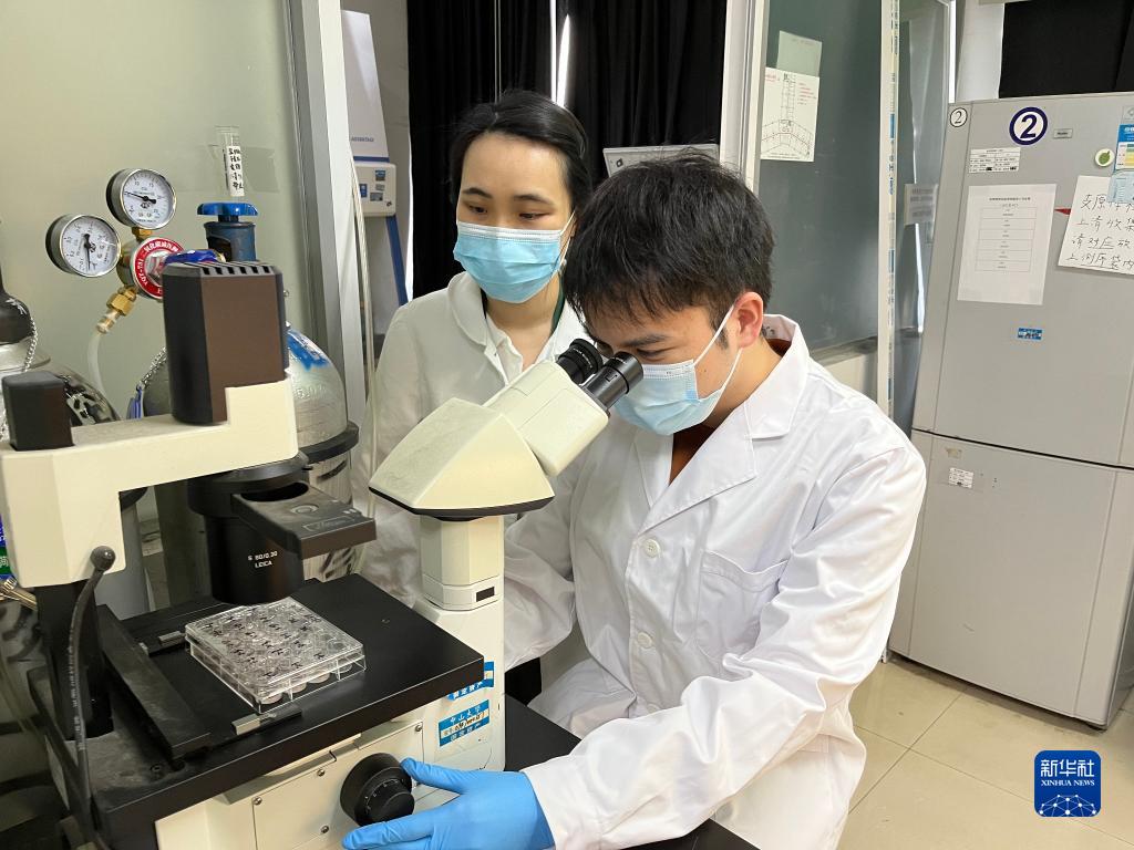 10月20日,廣東中山大學中山醫(yī)學院博士研究生張賢濤(右)在實驗室。新華社發(fā)