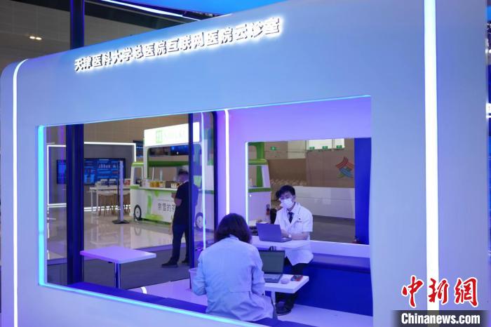 在天津醫(yī)科大學(xué)總醫(yī)院展廳,醫(yī)生在“云診室”通過互聯(lián)網(wǎng)醫(yī)院接診患者。記者了解到,在大會(huì)上,天津醫(yī)科大學(xué)總醫(yī)院宣布與科瑞泰醫(yī)療信息技術(shù)(天津)有限公司、360數(shù)字安全集團(tuán)天津公司、銳捷網(wǎng)絡(luò)股份有限公司、中國(guó)移動(dòng)通信集團(tuán)天津有限公司等開展合作,共同開啟互聯(lián)網(wǎng)醫(yī)院醫(yī)聯(lián)體“1236N”醫(yī)療健康服務(wù)新體系的建設(shè)之路。