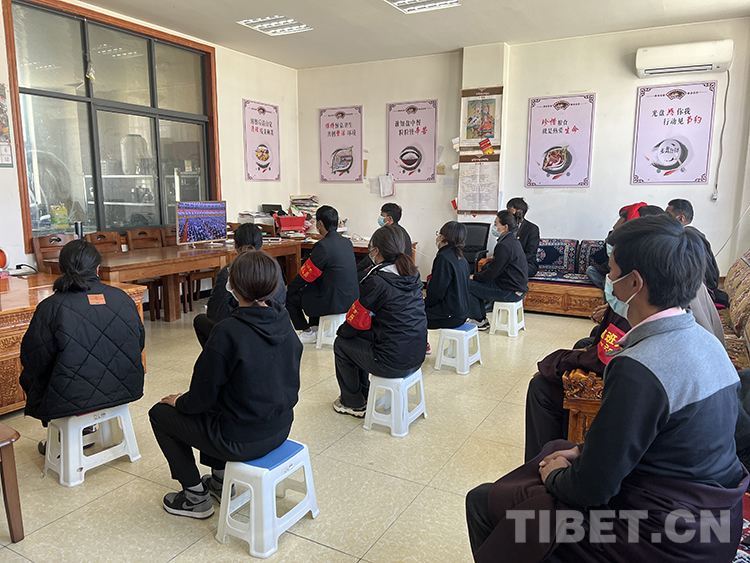圖為西藏自治區(qū)拉薩市堆龍德慶區(qū)德慶鎮(zhèn)門堆村村“兩委”、駐村工作隊(duì)等觀看黨的二十大開(kāi)幕會(huì) 攝影:鮑存根