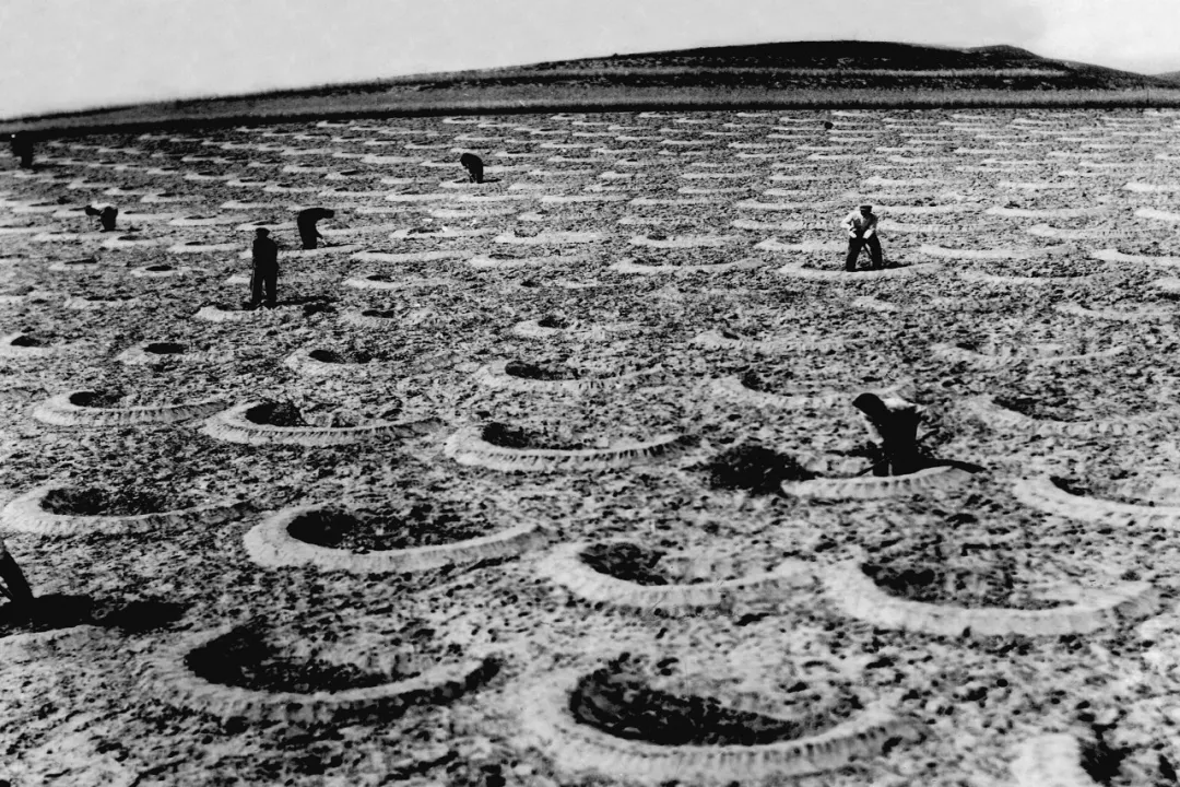 20世紀(jì)六七十年代,右玉縣群眾在荒山荒坡植樹(shù)(翻拍照片)。新華社發(fā)