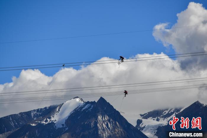 資料圖為2020年6月23日,西藏阿里聯(lián)網(wǎng)工程施工人員在日喀則希夏邦馬雪山附近走線作業(yè)。 江飛波 攝