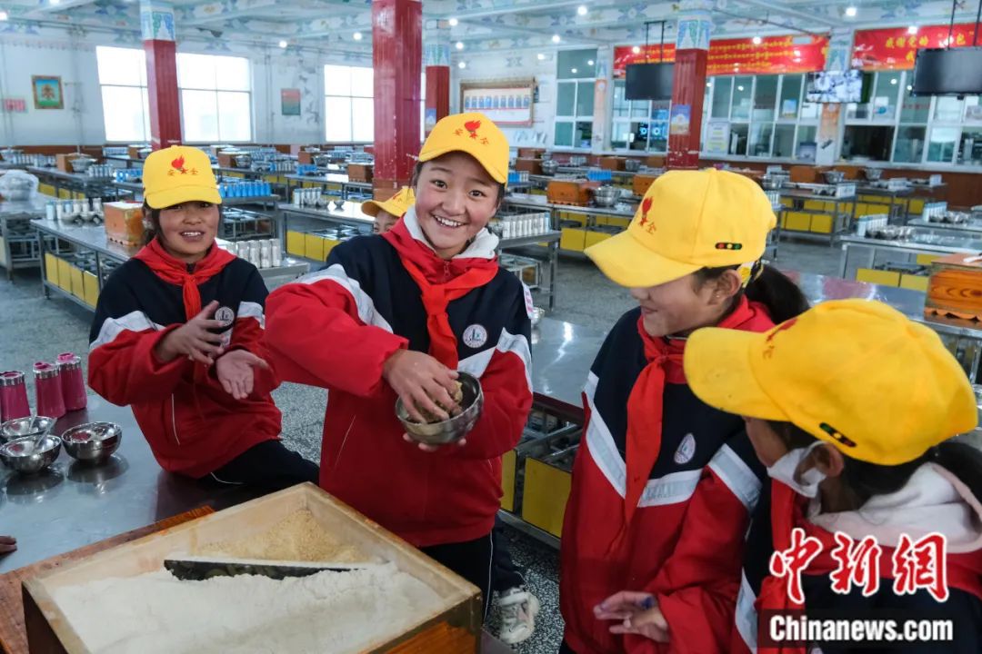 西藏班戈縣中石化小學學生在學校食堂捏糌粑。江飛波 攝