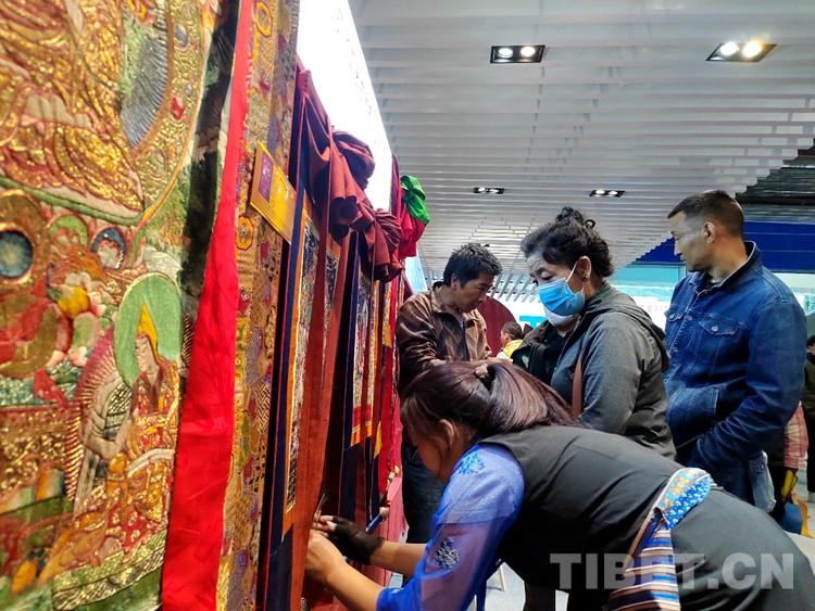 圖為市民在展銷活動現(xiàn)場選購唐卡