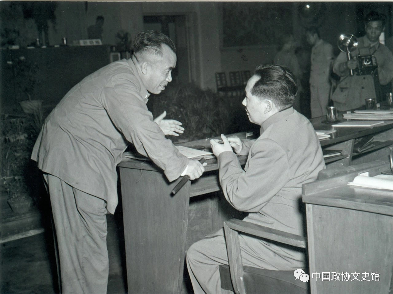 1950年6月23日,毛主席在大會(huì)休息時(shí)與朱德總司令交談。