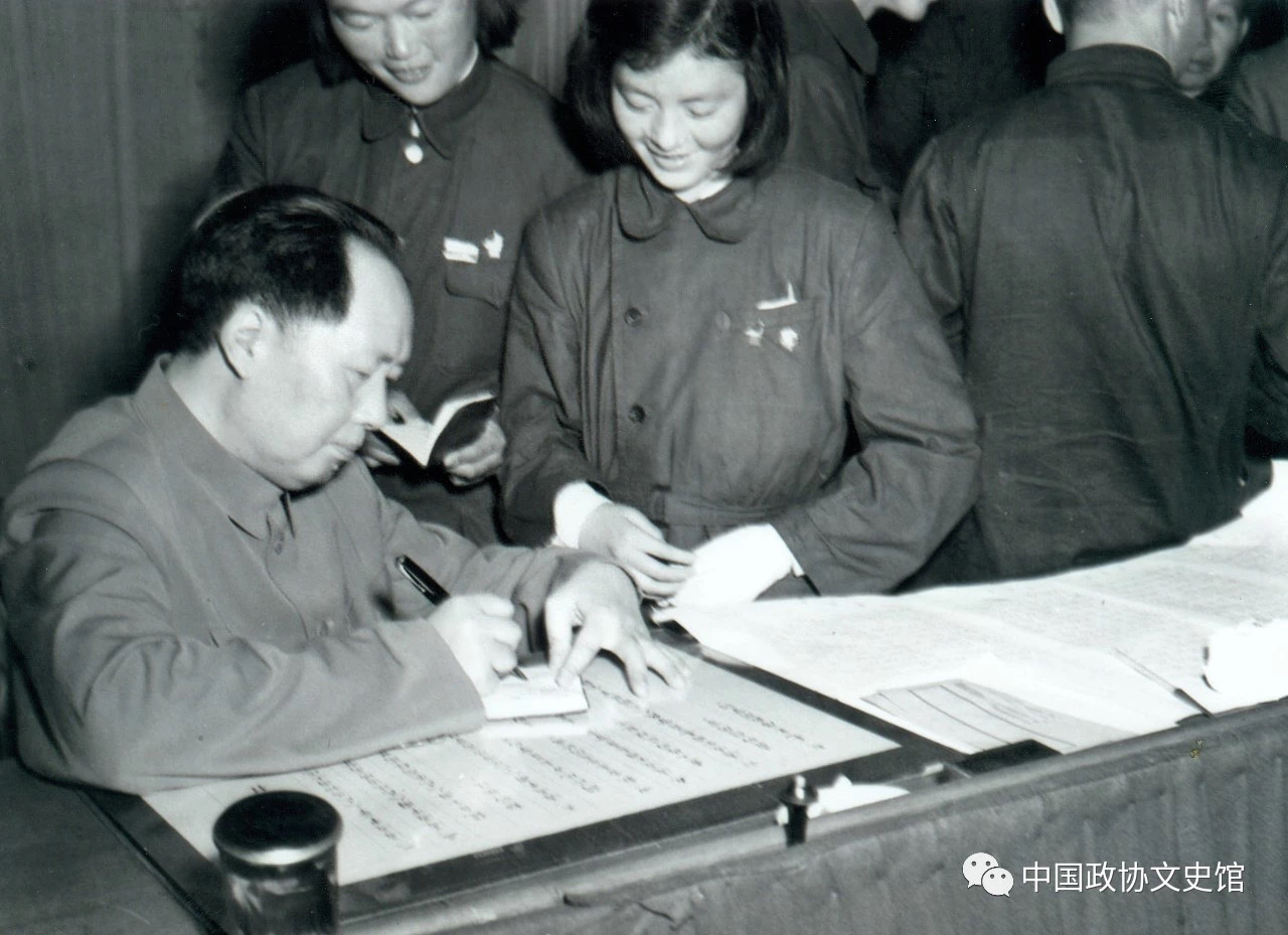 1950年6月23日,毛主席在大會(huì)休息時(shí)給參加會(huì)議的兩位勞模代表簽名。