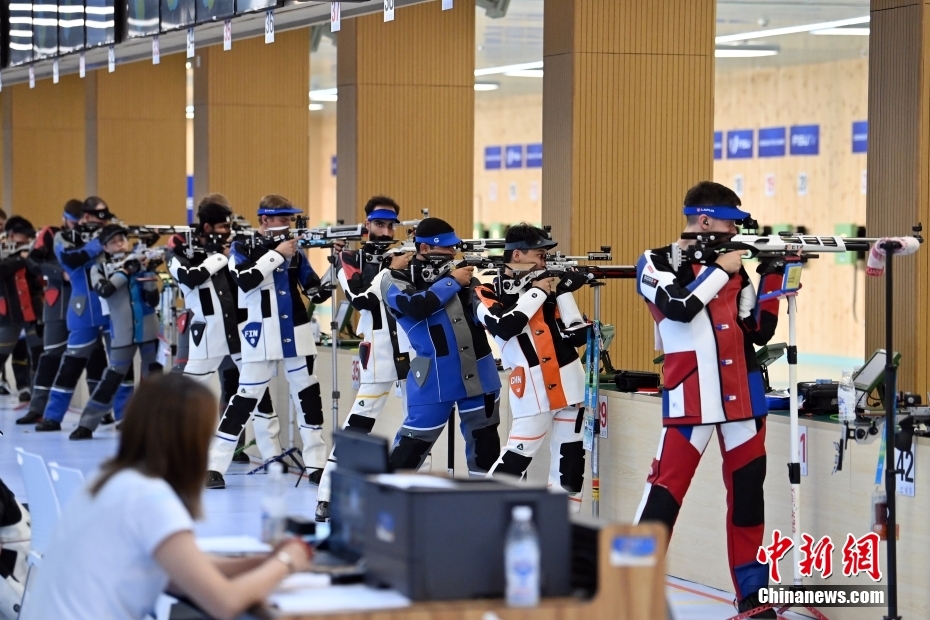 7月31日,第31屆世界大學(xué)生夏季運動會男子10米氣步槍團(tuán)體決賽在成都市射擊運動學(xué)校舉行,印度隊、中國隊、哈薩克斯坦隊分獲冠亞季軍。圖為男子10米氣步槍團(tuán)體決賽比賽現(xiàn)場。中新社記者 九美旦增 攝