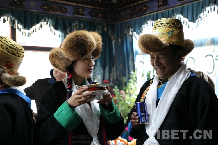 天亮以后,扎西江村一家人穿上新衣服,輪流敬切瑪、喝青稞酒,互道“扎西德勒”。扎西江村家的小女兒達娃倉決吃切瑪?shù)臅r候,先用拇指和食指抓起一小撮糌粑灑向空中3次,表示敬天地,然后把糌粑放進自己嘴里。喝青稞酒也同樣如此,要先用雙手接過酒杯,然后左手拿杯,右手無名指輕輕地在杯中蘸酒,彈向空中,如此反復三次。