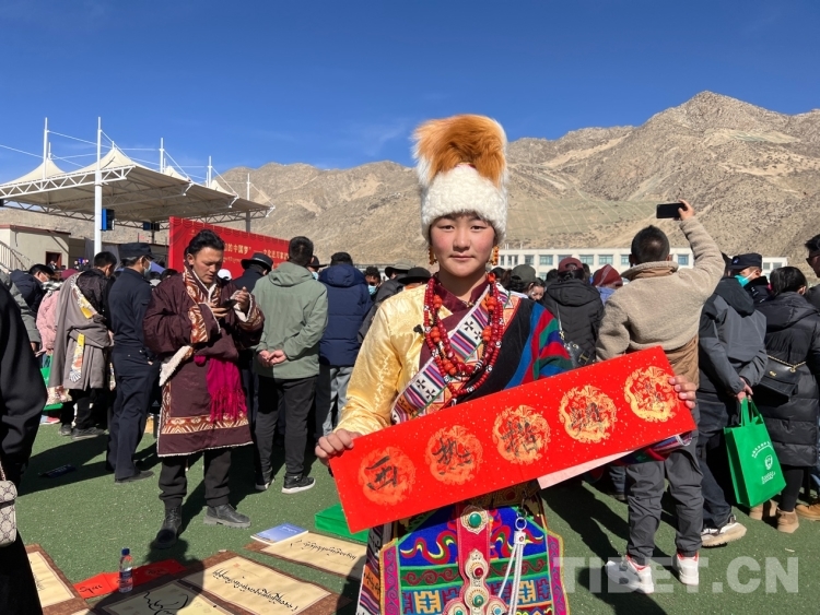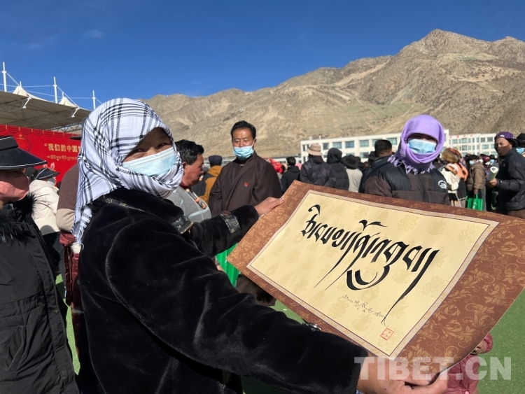 圖為群眾拿到寫(xiě)有“幸福家庭”字樣的書(shū)法作品 攝影:德吉卓瑪