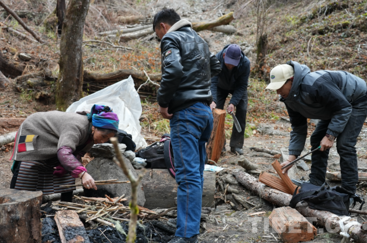 過了兩個小時,我們到達了平時巡邊人休息的地方。有人撿柴火、有人去接水,每個人都分工明確。扎西江村的背包里帶著方便面、優(yōu)樂美奶茶、可樂等,巡邊的每位隊員都拿出了自己包里的食物與大家分享。大家圍坐一起有說有笑,完全忘記了一路的艱辛與疲憊。