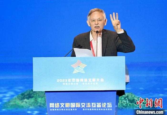 7月18日,2023年中國網(wǎng)絡(luò)文明大會網(wǎng)絡(luò)文明國際交流互鑒論壇在廈門舉辦。圖為廈門大學(xué)美籍教授潘維廉作主題演講。中新社記者 王東明 攝