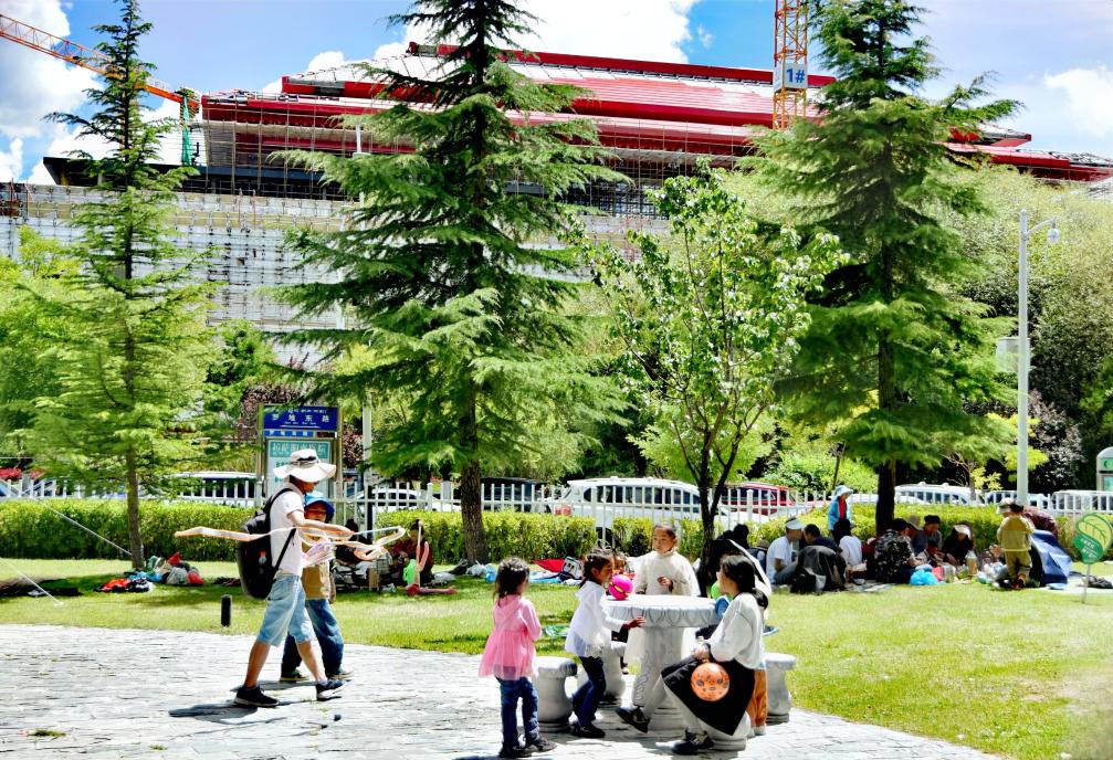 雪頓節(jié)期間,西藏各個(gè)景點(diǎn)游人如織、熱鬧非常。拉薩市民準(zhǔn)備好毯子和小吃,到羅布林卡“過(guò)林卡”。園林內(nèi),既有小橋流水,也有恢弘建筑,雪頓節(jié)期間更有持續(xù)不斷的藏戲表演。