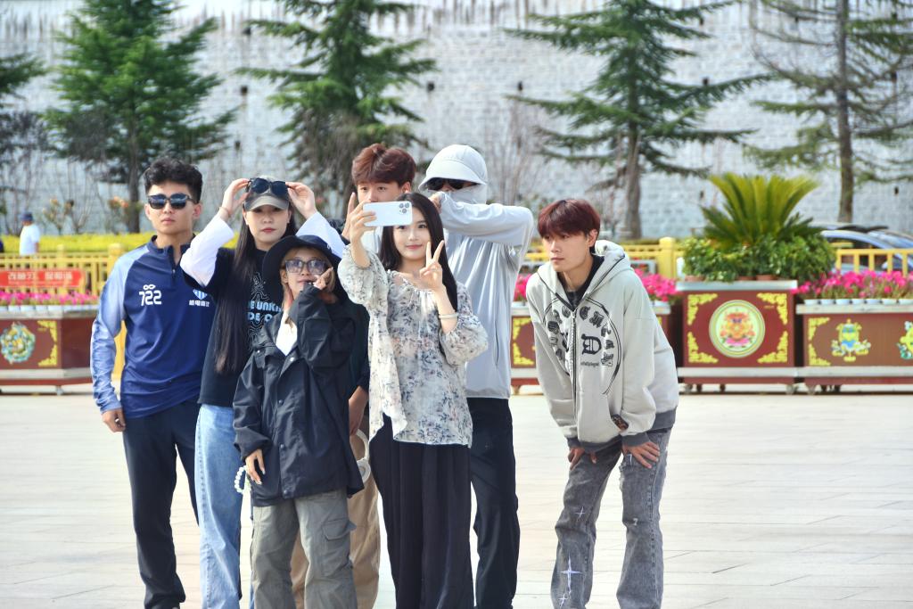 8月17日,布達(dá)拉宮廣場(chǎng),游客們拍照留念。新華社記者 劉文博 攝