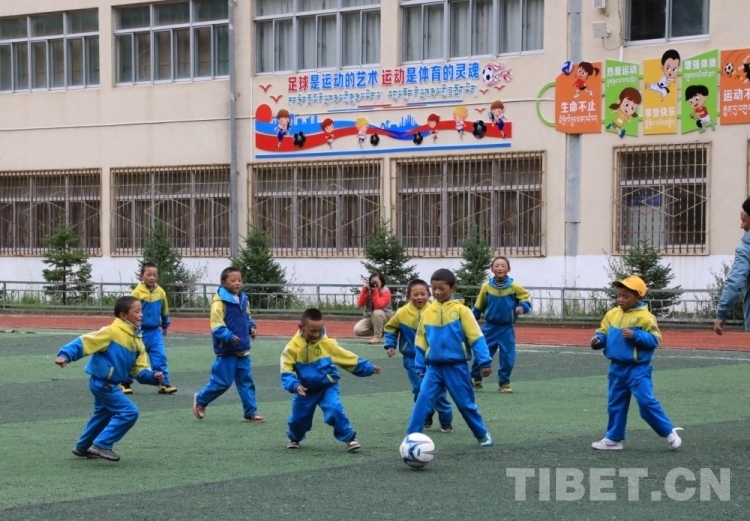 和達(dá)瓦一起走進(jìn)校園,邁入寬闊的操場(chǎng),主席臺(tái)后面的樓房上有句醒目的標(biāo)語——“足球是運(yùn)動(dòng)的藝術(shù),運(yùn)動(dòng)是體育的靈魂”。恰逢孩子們?cè)谏象w育課,到了踢球環(huán)節(jié),歡呼聲在操場(chǎng)上此起彼伏,一個(gè)個(gè)小小的藍(lán)色身影飛快地追逐著足球奔跑。我們也不禁感嘆體育的快樂、踢球的快樂。