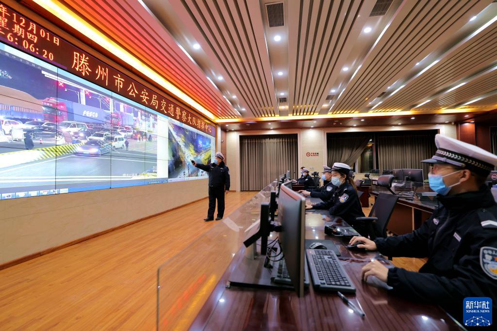 12月1日,在山東省滕州市公安局交警大隊(duì)指揮中心,借助“情、指、勤、督”一體化智慧交通管理平臺,民警對各個(gè)路口及路段交通流數(shù)據(jù)進(jìn)行綜合分析。新華社發(fā)(鐘自增 攝)