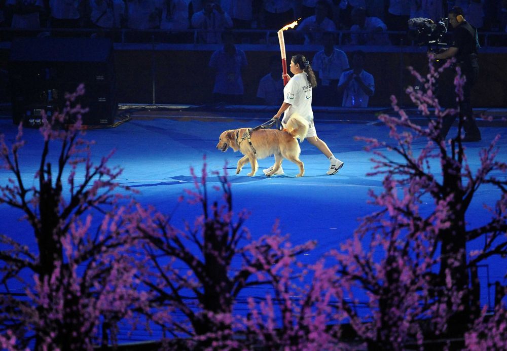 2008年9月6日,北京2008年殘奧會(huì)開(kāi)幕式在國(guó)家體育場(chǎng)隆重舉行,火炬手平亞麗在進(jìn)行火炬?zhèn)鬟f。新華社記者王頌攝