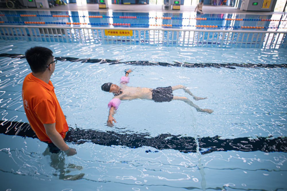 10月19日,殘疾人在杭州市錢(qián)塘區(qū)河莊文體中心無(wú)障礙游泳館內(nèi)游泳。新華社記者 江漢 攝