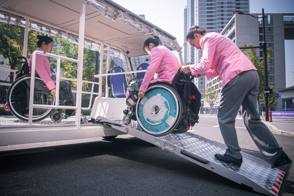 10月16日,中國體育代表團成員在杭州亞殘運村內乘坐無障礙接駁車出行。新華社記者 江漢 攝