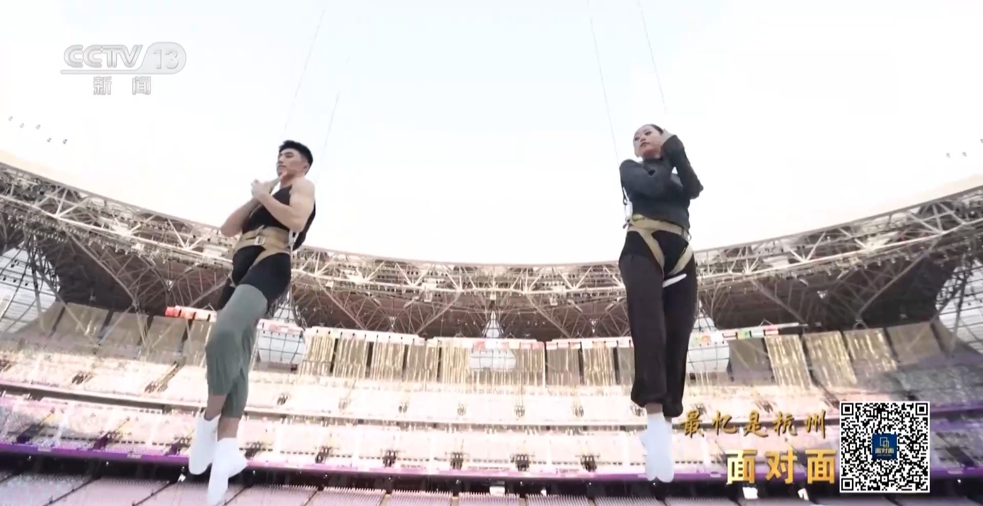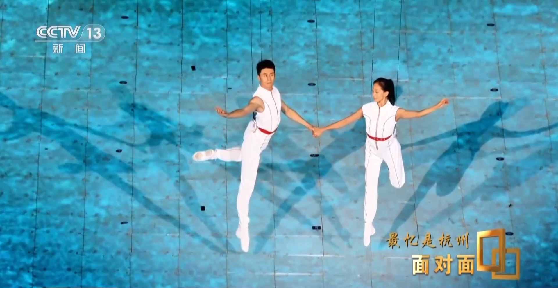 這是《錢塘潮涌》篇章中的雙人3D威亞節(jié)目,展現(xiàn)了勇立潮頭的波瀾壯闊場(chǎng)景,這也是世界上首次在大型運(yùn)動(dòng)場(chǎng)空間中使用雙3D威亞技術(shù)。