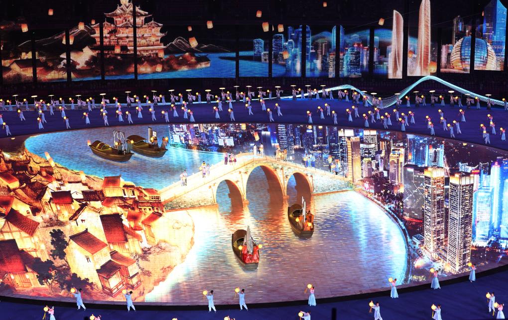 良渚遺址、錢江涌潮、西湖山水、運河古橋;巨幅網幕中,展開精心雕琢的“花中四君子”屏風;“團扇”地屏上,浮現出梅蘭竹菊、松荷柳桂,葉葉扁舟承載著琴棋書畫、詩詞酒茶……杭州第19屆亞運會開幕式呈現的泱泱中華國風雅韻、江南水鄉(xiāng)詩情畫意,歷歷在目,余音繞梁,令觀眾心潮激蕩,久久難以忘懷。