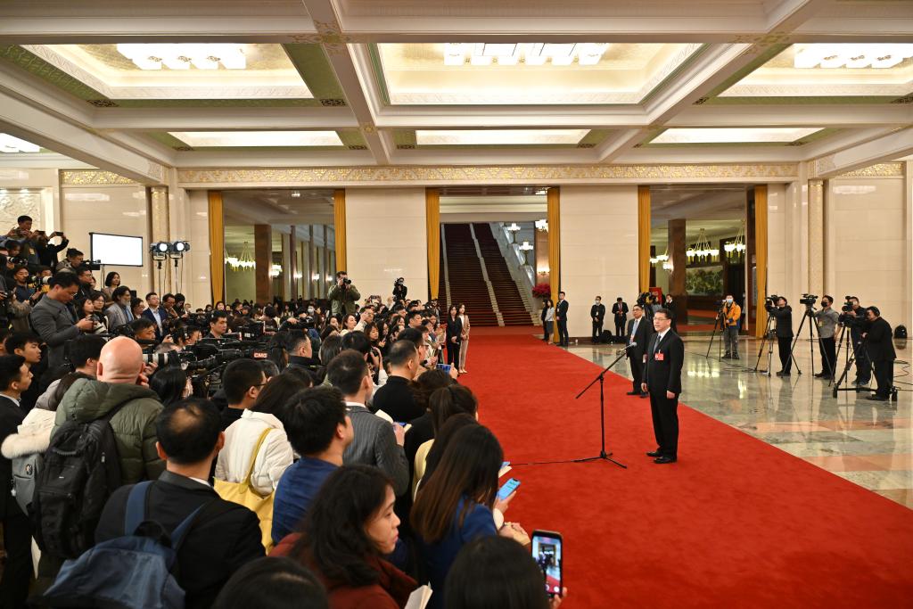 3月5日,第十四屆全國人民代表大會(huì)第二次會(huì)議首場“部長通道”集中采訪活動(dòng)在北京人民大會(huì)堂舉行。這是水利部部長李國英接受媒體采訪。新華社記者 劉續(xù) 攝