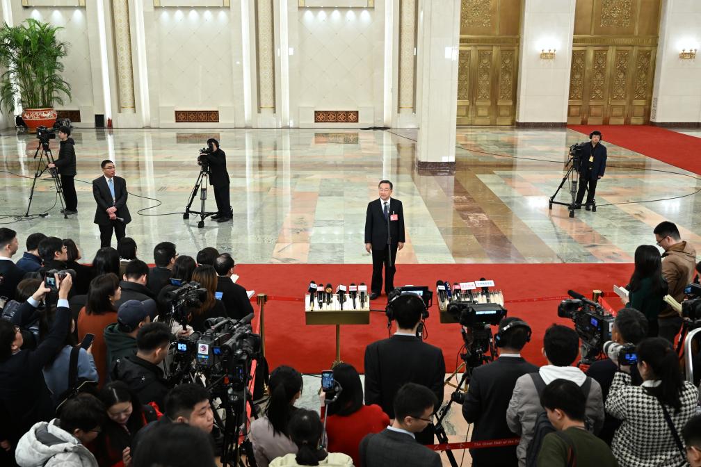 3月5日,第十四屆全國人民代表大會(huì)第二次會(huì)議首場“部長通道”集中采訪活動(dòng)在北京人民大會(huì)堂舉行。這是水利部部長李國英接受媒體采訪。新華社記者 牟宇 攝
