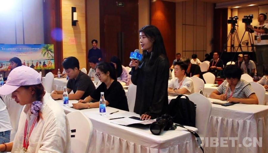 圖為中國西藏網(wǎng)記者在第十二屆全國少數(shù)民族傳統(tǒng)體育運動會黑龍江、福建、西藏代表團新聞發(fā)布會上提問 攝影:劉莉