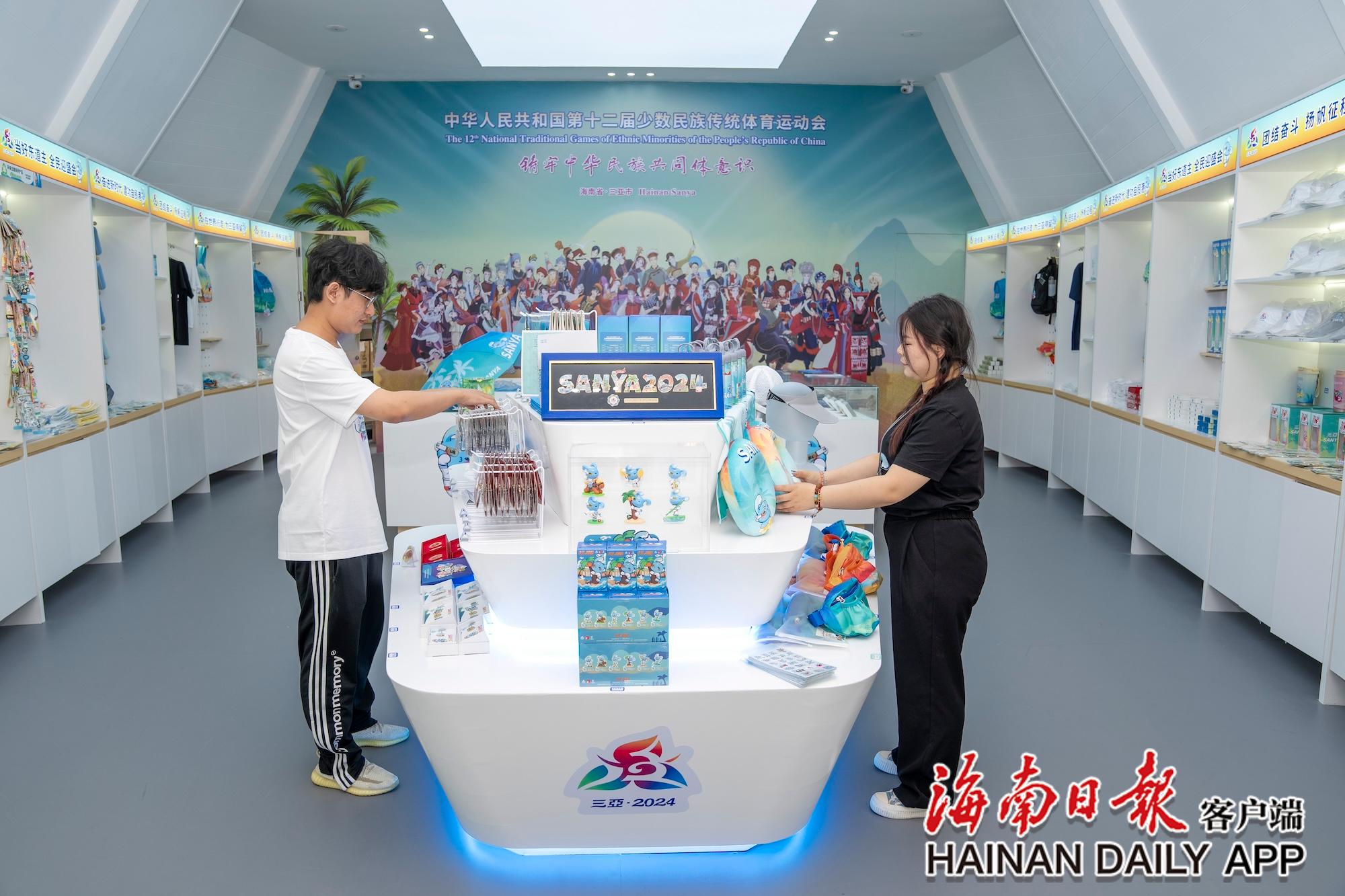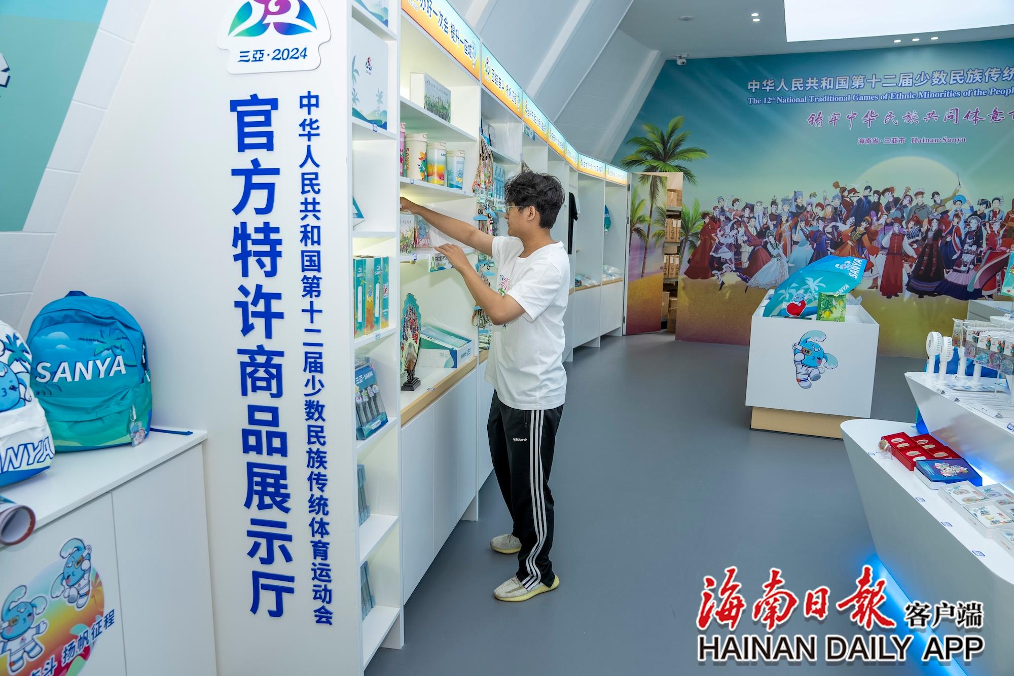 11月8日,在三亞灣紅樹林度假世界的第十二屆全國少數(shù)民族傳統(tǒng)體育運動會(以下簡稱運動會)官方特許商品展示廳內(nèi),工作人員在擺放運動會特許商品。