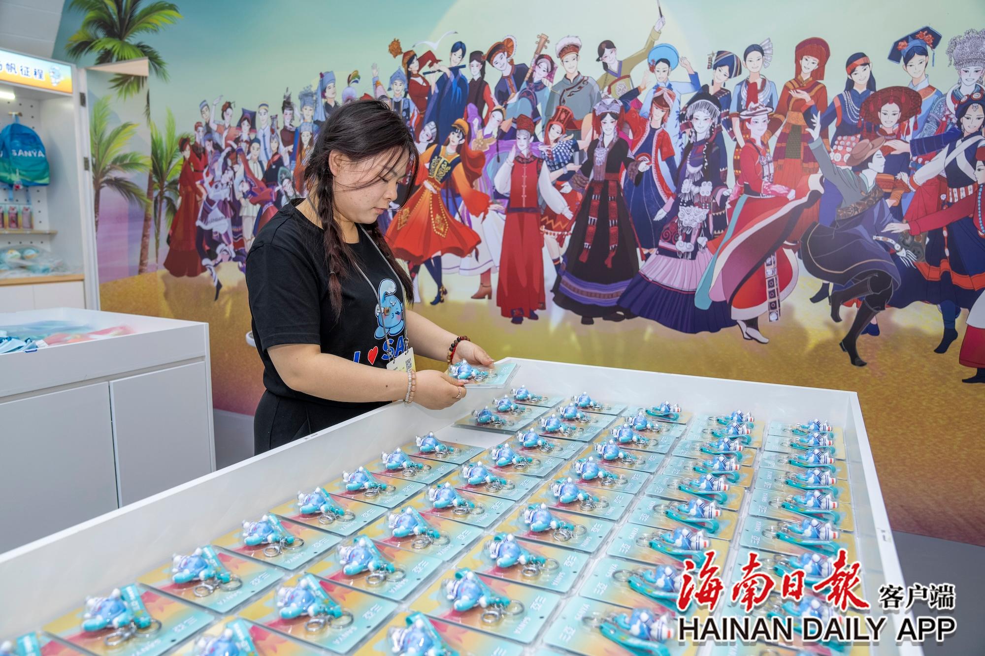11月8日,在三亞灣紅樹林度假世界的運動會官方特許商品展示廳內(nèi),工作人員擺放鑰匙扣。海南日報全媒體記者 李天平 攝