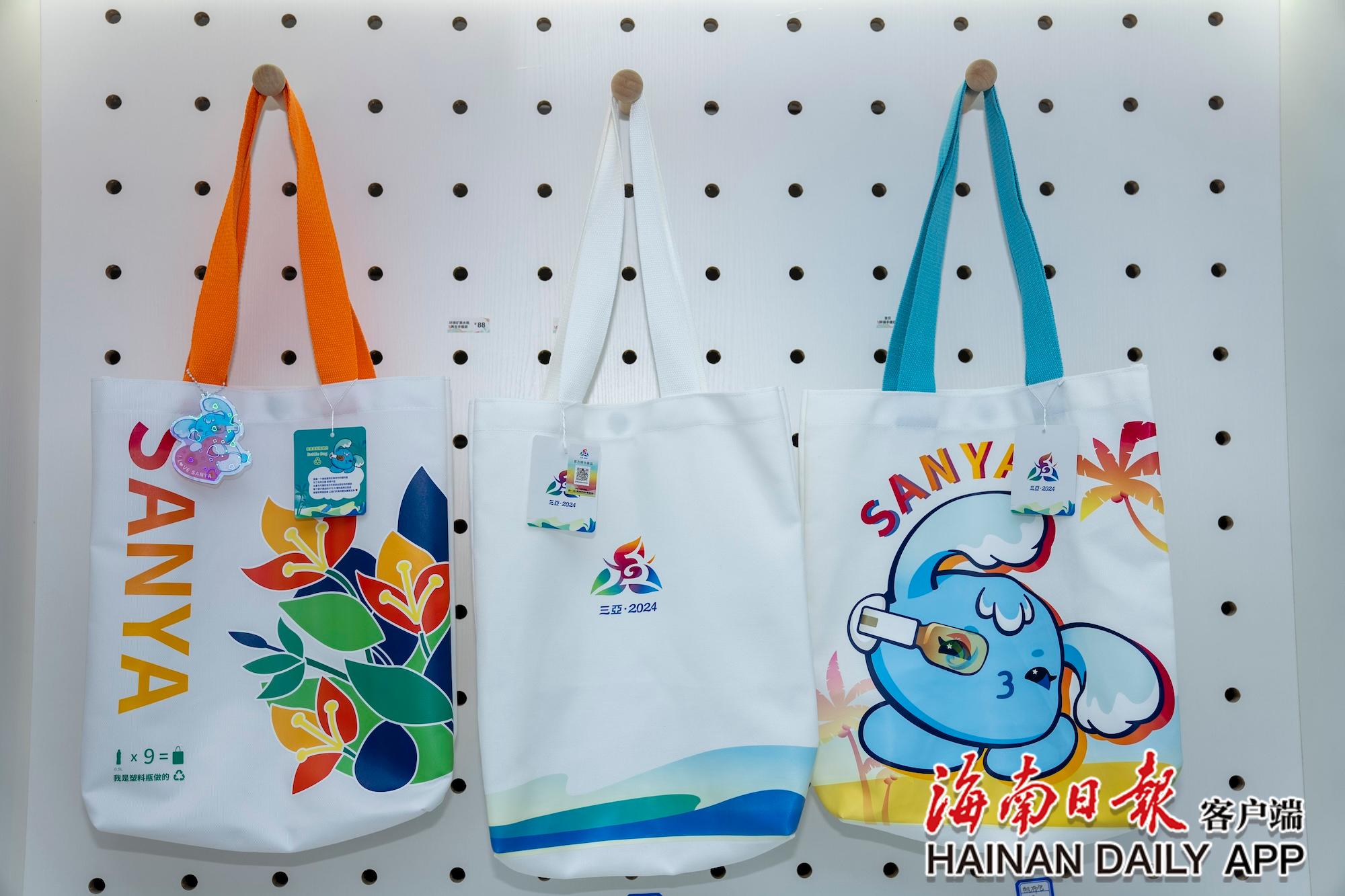 11月8日,三亞灣紅樹林度假世界的運動會官方特許商品展示廳內(nèi)的環(huán)保礦泉水瓶再生手提袋。海南日報全媒體記者 李天平 攝