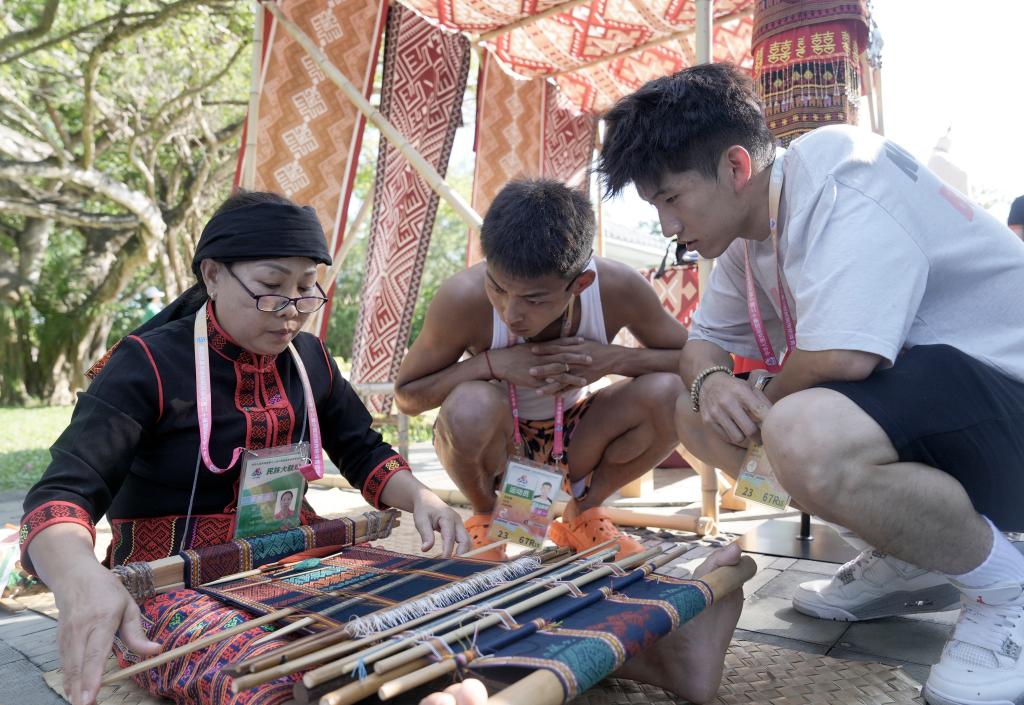 11月26日,演員(左)在活動中為代表團成員展示黎族傳統(tǒng)紡染織秀技藝。當(dāng)日,第十二屆全國少數(shù)民族傳統(tǒng)體育運動會民族大聯(lián)歡活動在海南省三亞市舉行。新華社記者 胡超 攝