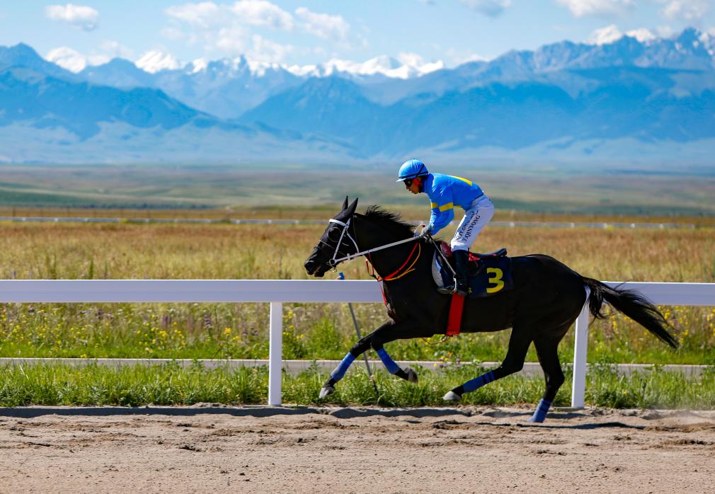 7月13日,湖北代表隊選手覃勇和賽馬“雁春金冠”在比賽中。當(dāng)日,第十二屆全國少數(shù)民族傳統(tǒng)體育運動會馬上項目民族賽馬8000米比賽在新疆昭蘇進行。新華社記者 陳朔 攝