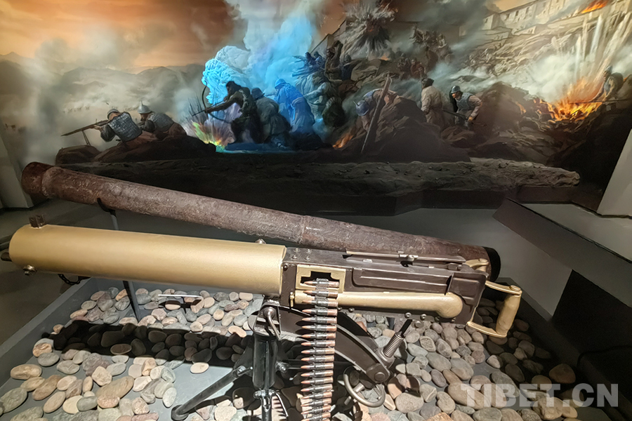 圖為宗山號角——紀念西藏江孜抗英保衛(wèi)戰(zhàn)120周年主題展現(xiàn)場,英軍當時使用的馬克沁機槍模型(前),藏軍使用的土炮(后),背景為相關歷史場景的視覺還原。馬克沁機槍是全自動機槍,也是當時殺傷力較大的武器,理論射速達600發(fā)/分鐘 攝影:楊月云