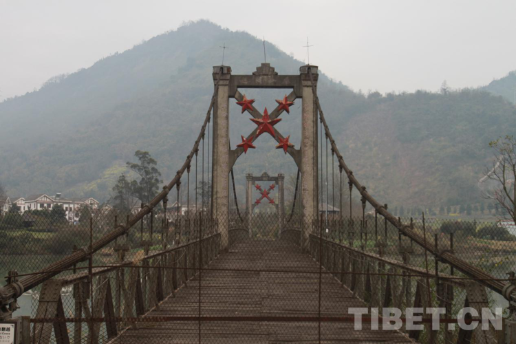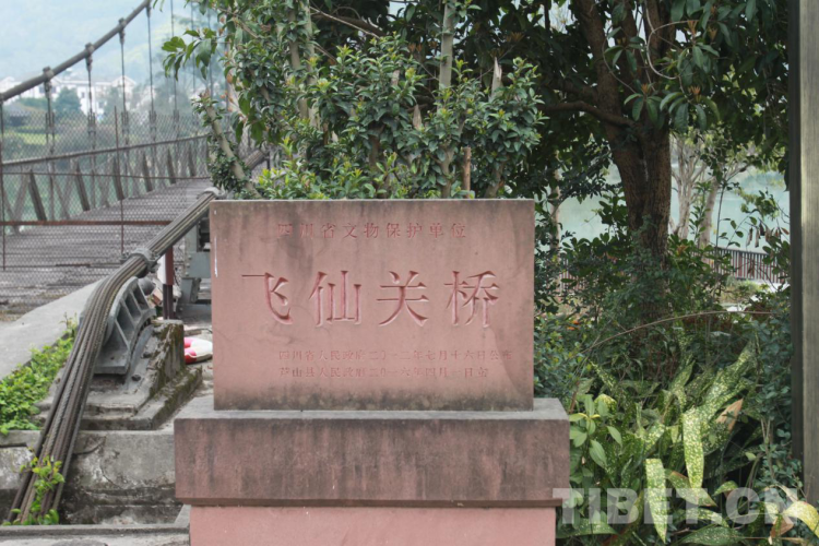 站在橋邊,遙望蜿蜒的江水就是青衣江,飛仙關(guān)橋全長(zhǎng)164米,寬4.5米,索塔為鋼筋混凝土門式框架,高29米,流動(dòng)式索鞍,策略式索錠,當(dāng)時(shí)的設(shè)計(jì)載重為15噸。橋柱橫額上有時(shí)任西南軍政委員會(huì)主席劉伯承所題寫的橋名——“飛仙關(guān)橋”。橋西岸塔柱有時(shí)任十八軍政委譚冠三題寫的檻聯(lián)——“發(fā)揮天才,發(fā)揮力量,戰(zhàn)勝困難,創(chuàng)造人民幸福,一面進(jìn)軍,一面建設(shè)解放西藏,鞏固西南國防”的字樣。東岸塔柱上有時(shí)任西康省主席廖志高題寫的檻聯(lián)——“勞動(dòng)創(chuàng)造世界飛仙天險(xiǎn)何難克服,革命帶來幸福閉塞邊區(qū)從此繁榮”字樣。橋上五顆閃閃的紅星,映照著飛仙關(guān)的繁榮,也印證著革命前輩們的美好愿景已經(jīng)變?yōu)楝F(xiàn)實(shí)。