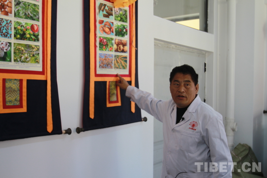 圖為尼偉藏醫(yī)康復(fù)醫(yī)院負責人布地介紹畫在唐卡上的生物 攝影:登真巴珍