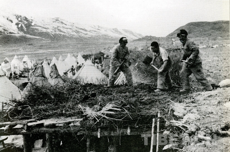 圖為1951年4月,修建簡(jiǎn)易機(jī)場(chǎng)時(shí),戰(zhàn)士們?cè)诖罱ㄗ∷迬づ窈秃?jiǎn)易房 。