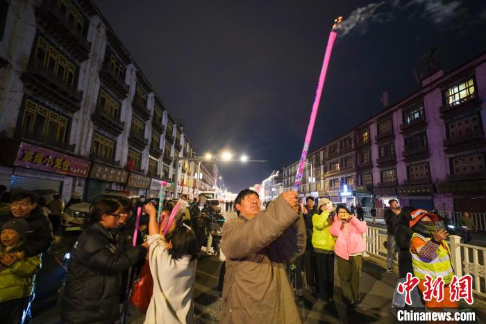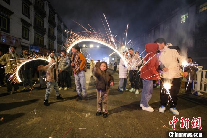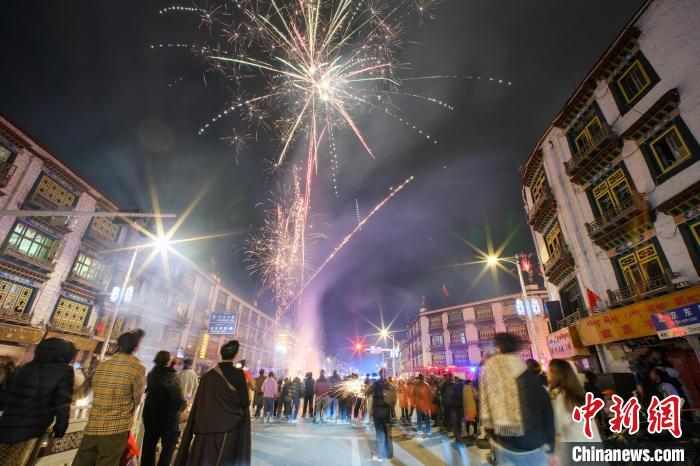 藏歷新年是西藏傳統(tǒng)民俗活動(dòng),也是中國國家級(jí)非物質(zhì)文化遺產(chǎn)。2月27日,西藏迎來一年一度的藏歷新年古突夜(類似春節(jié)的除夕),如今過古突夜,西藏民眾在點(diǎn)燃火把的同時(shí),也會(huì)燃放煙花,古城拉薩煙花璀璨。圖為2月27日晚,拉薩當(dāng)?shù)孛癖娕c游客等在街頭共同慶祝藏歷木蛇新年的到來。中新社記者 江飛波 攝