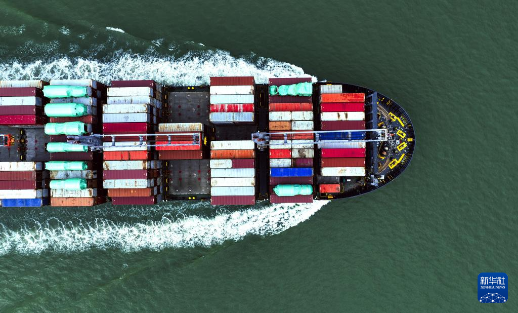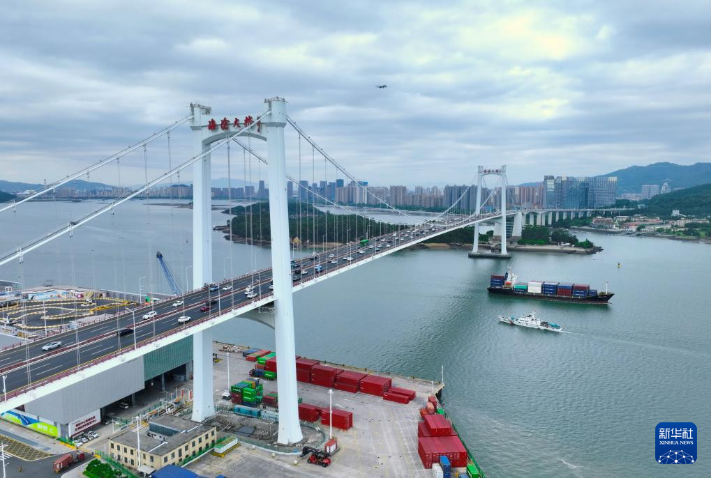 8月6日,從廈門港海天碼頭駛出的一艘集裝箱貨輪經(jīng)過廈門海滄大橋。